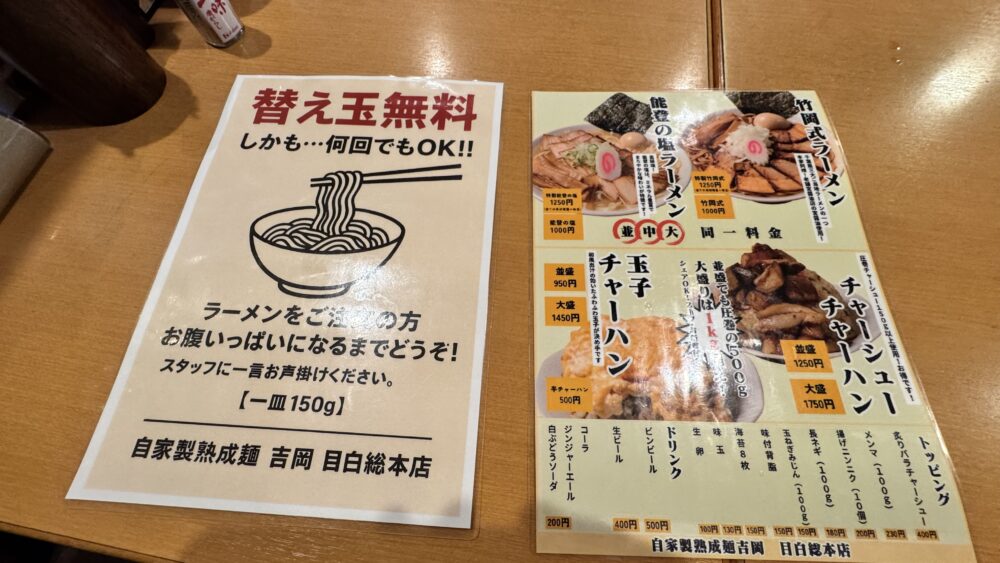 ラーメン注文で何度でも替え玉無料(1皿150g)。