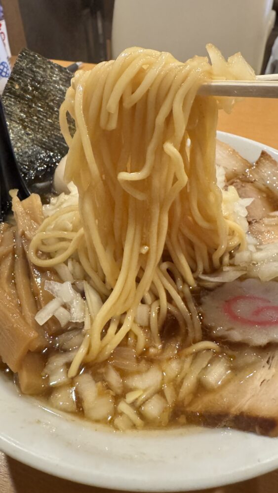 ▲麺は、パツっと食感の自家製麺。醬油スープが絡んで美味しい。