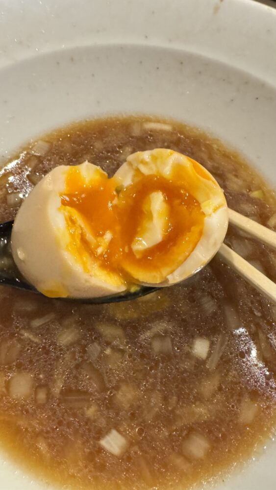 ▲ラストはデザート代わりに味玉。黄身が半熟で美味。スープで追いかえると最高。
