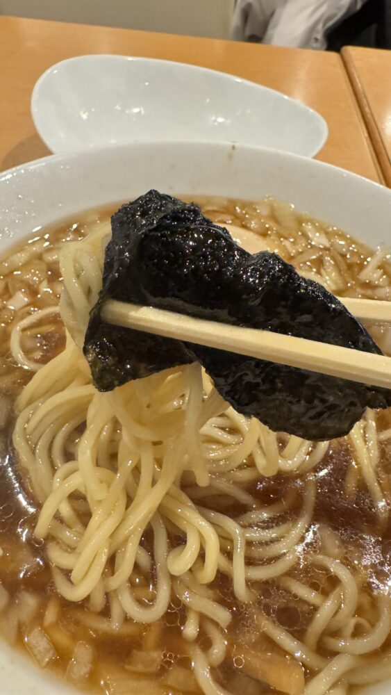 ▲スープに浸した海苔で麺を巻いて食べます。磯感が醤油スープと相性が良くて美味。