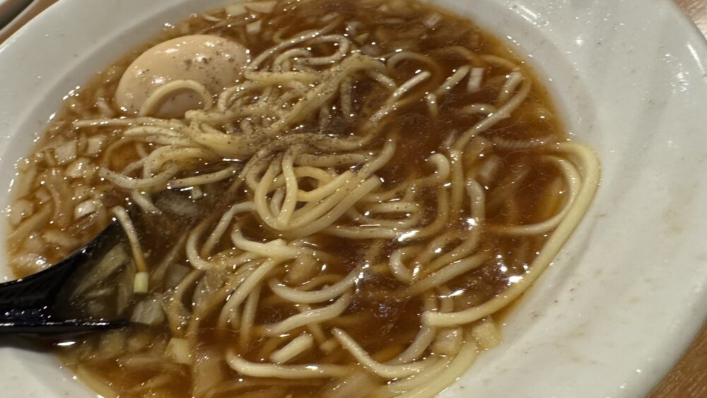 ▲卓上の胡椒で味変。胡椒で醤油スープの味が引き締まって、良き味変。