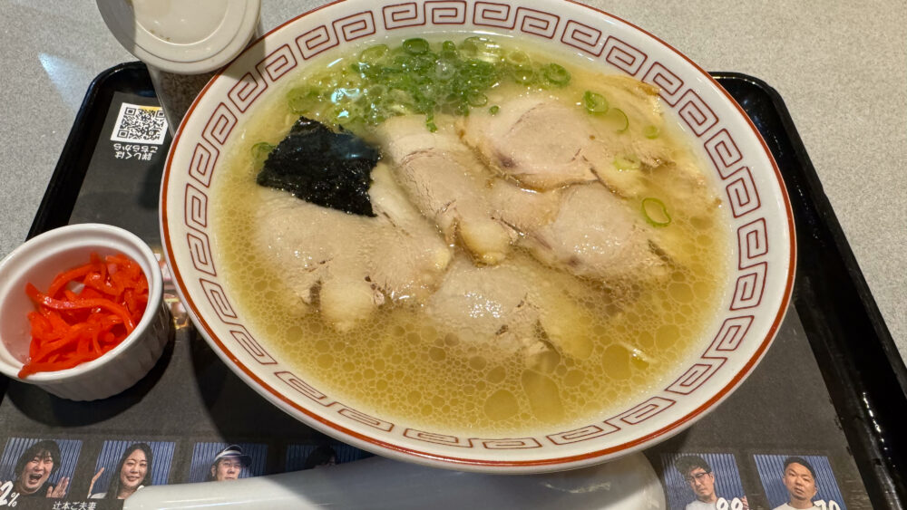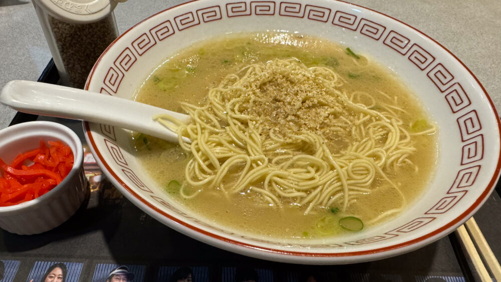博多ラーメン健太肉増しが着丼!「クサうま」の言葉通り本場の豚骨ラーメンの香りが食欲をそそります!紅生姜とすりごまも付属。