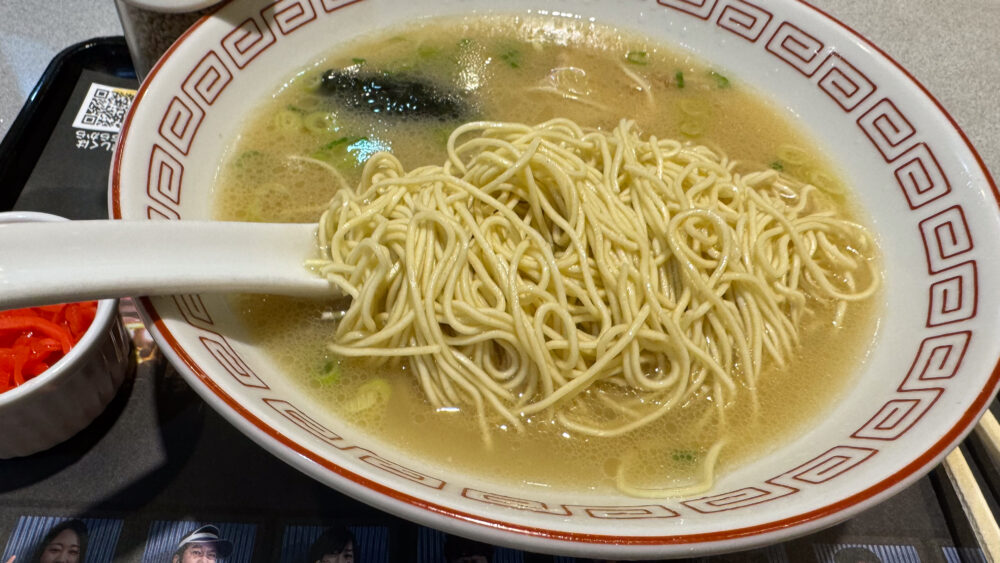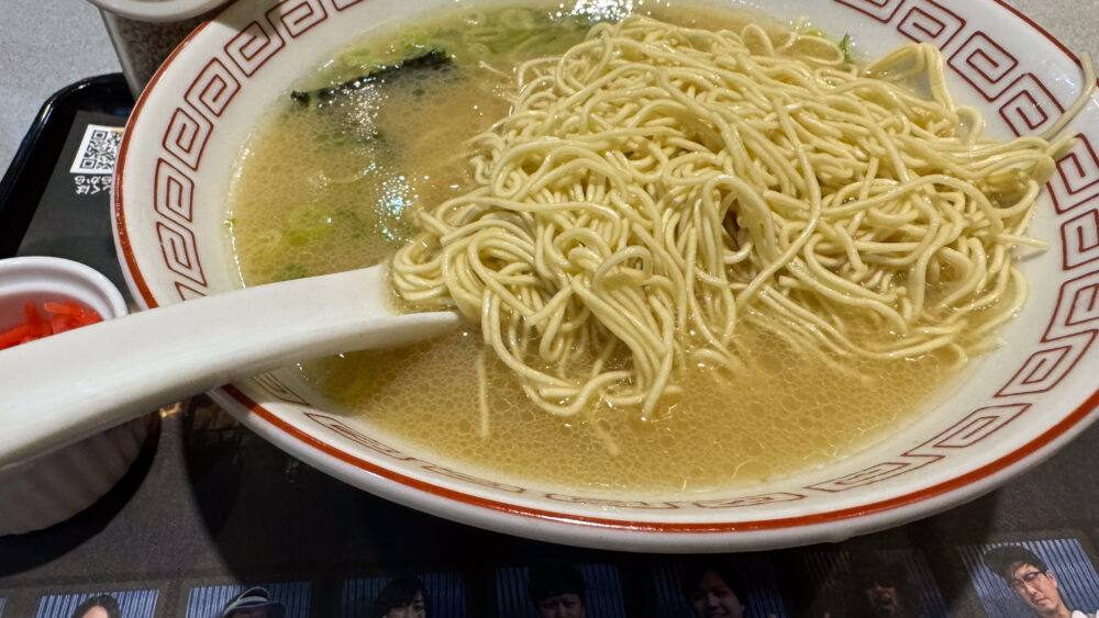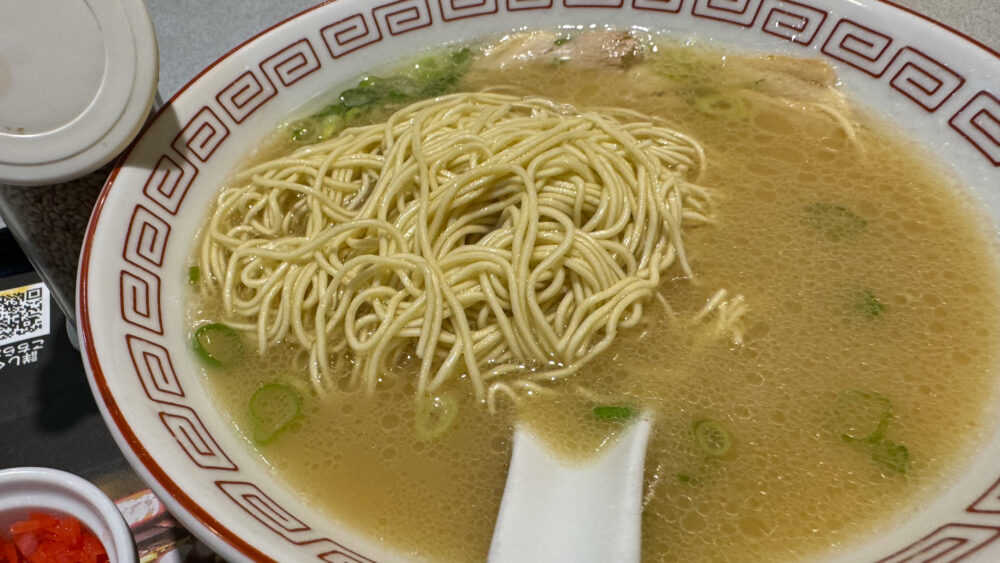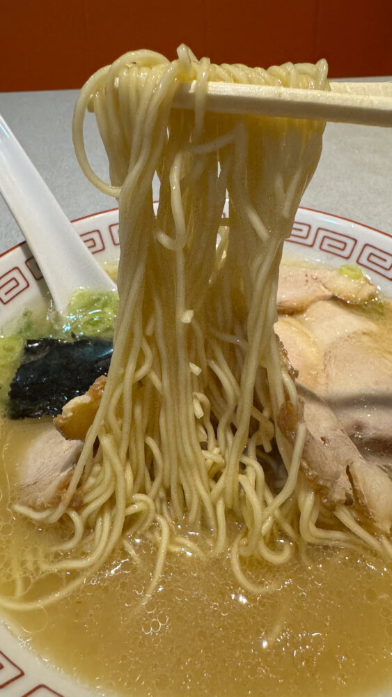 ▲麺はパツっとした極細麺。花月嵐史上初とのこと。スープの持ち上げも良き。