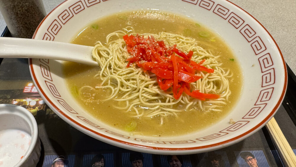 ▲6回目の替玉を注文。付属の紅生姜で味変。紅生姜の酸味がオアシス的存在。