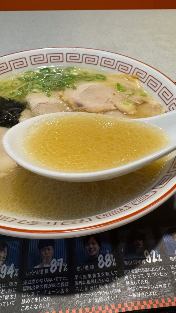 ▲スープは豚骨の旨みを感じる本格派。再現度89%らしいですが、この時点で本店の味が気になって仕方がないです。