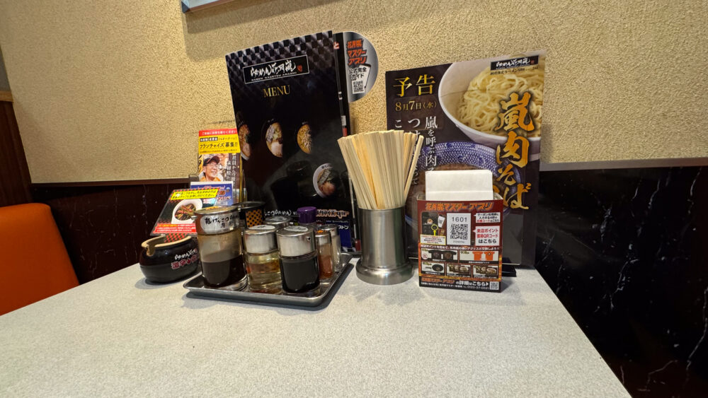 ▲卓上調味料は嵐げんこつらあめん専用タレ、醤油、お酢、唐辛子など。激辛壺ニラもやしは店員さんへ注文すると提供してもらえます。