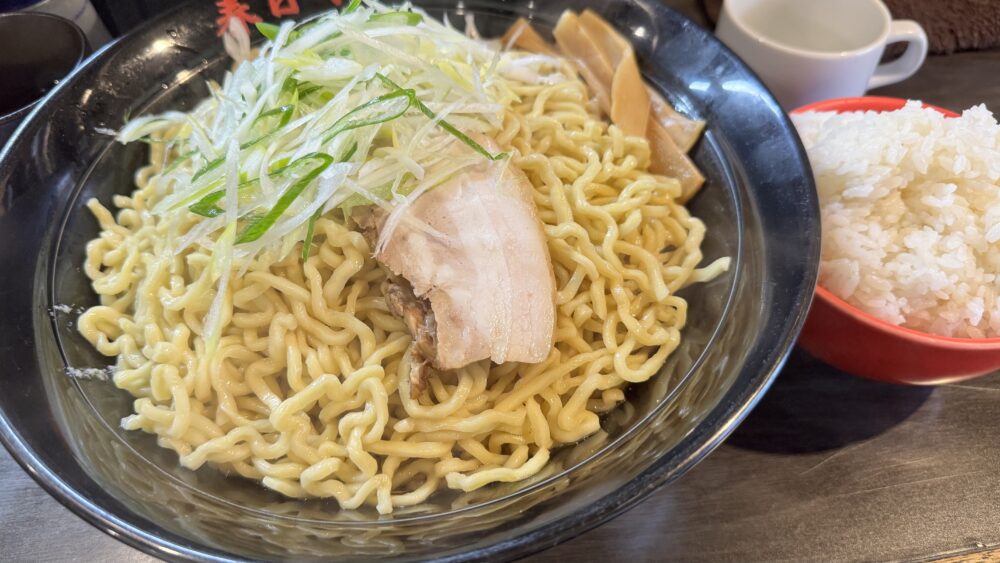 しょうゆ油そば最強盛+ライス大盛が着丼!ネギ・チャーシュー・メンマといったシンプルなビジュアル。