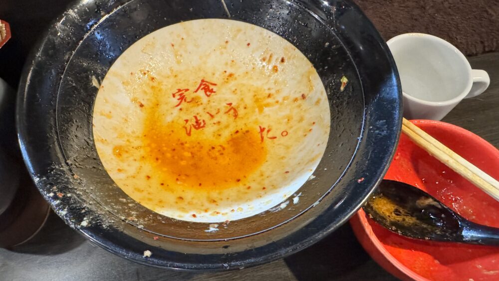 ▲だいたい12分くらいで完食!!丼の底の「完食油とうございました。」が見えて嬉しい。