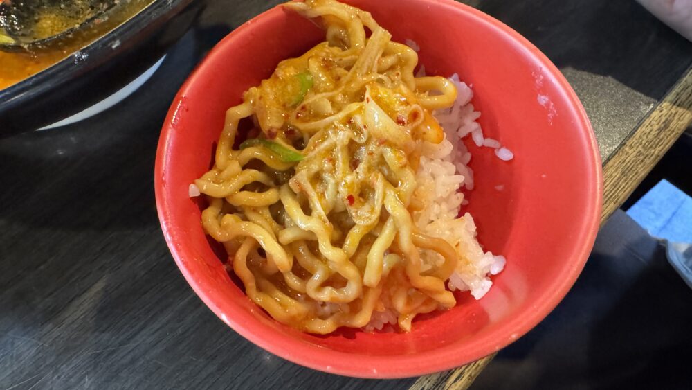 ▲これまたジャンボにならい、温存したライスへ残った麺とタレを乗せて油そば丼を作成。タレがライスに合う!