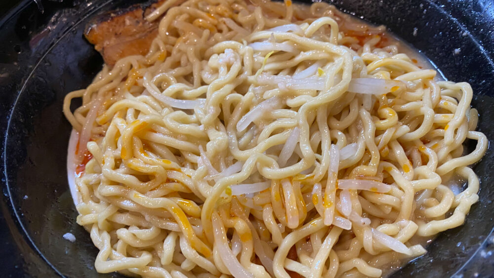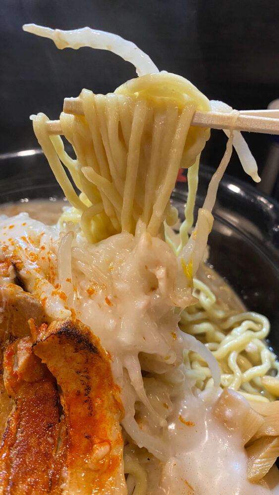 ▲混ぜ終わり、麺一本ごとに白い背脂をコーティング。この麺がツルモチで旨し。鳥豚の旨味も感じられます。