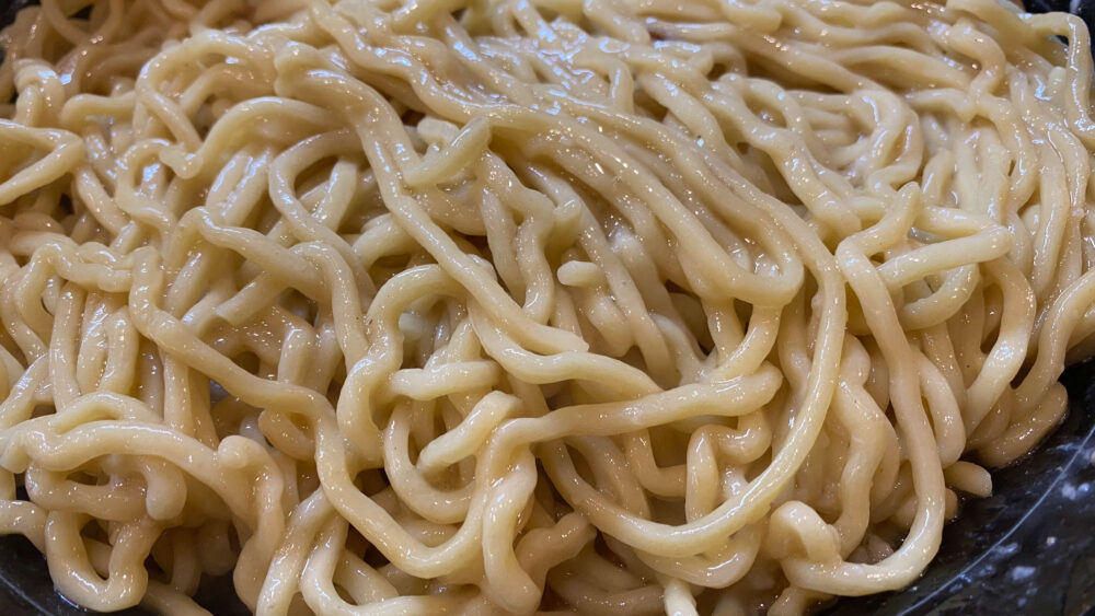 ▲麺を引っ張り上げてまずは混ぜ合わせていきます。麺はやや縮れた中太麺。