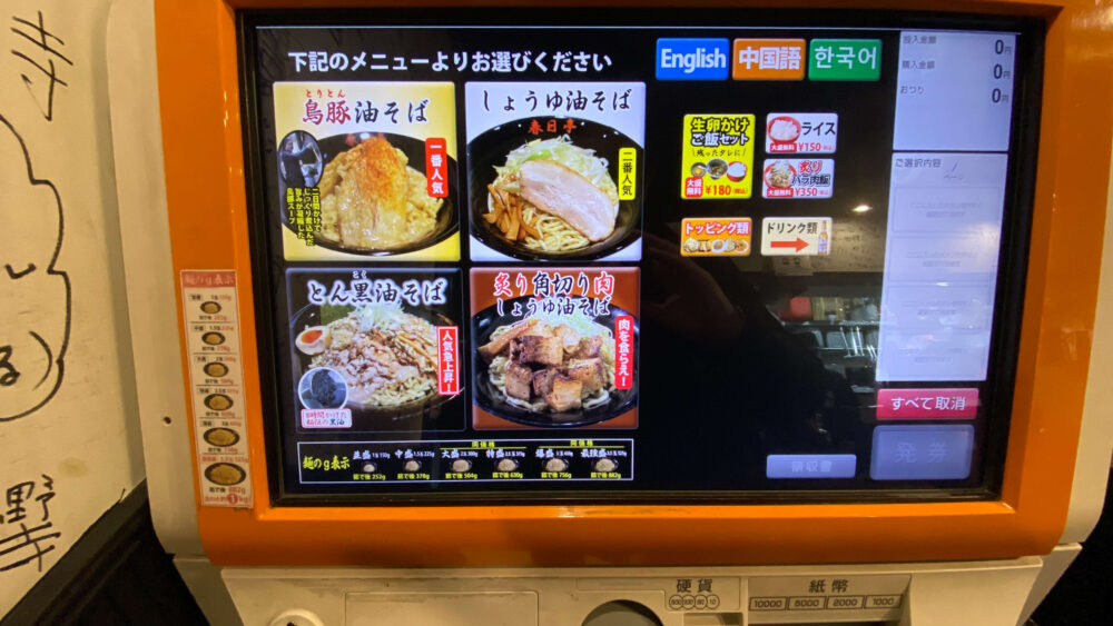 ▲入店するとデジタルな食券機があります。麺量もg表示されているので安心です。