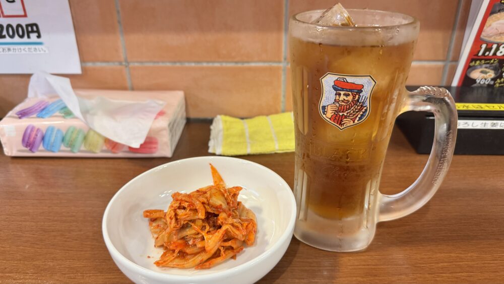 ▲ウーロンハイとキムチから到着。ウーロンハイをちょい飲みしながらラーメンを待ちます。