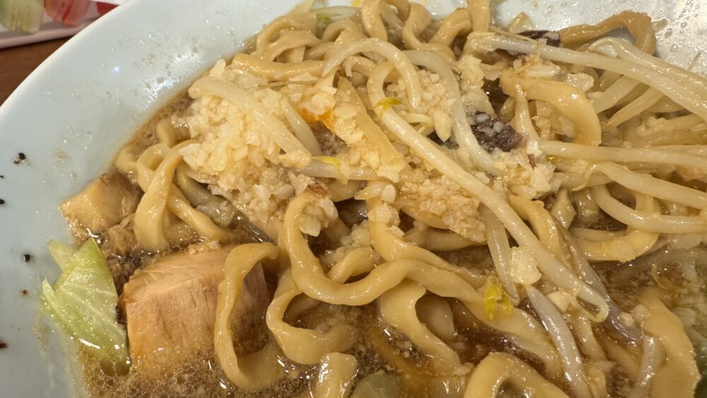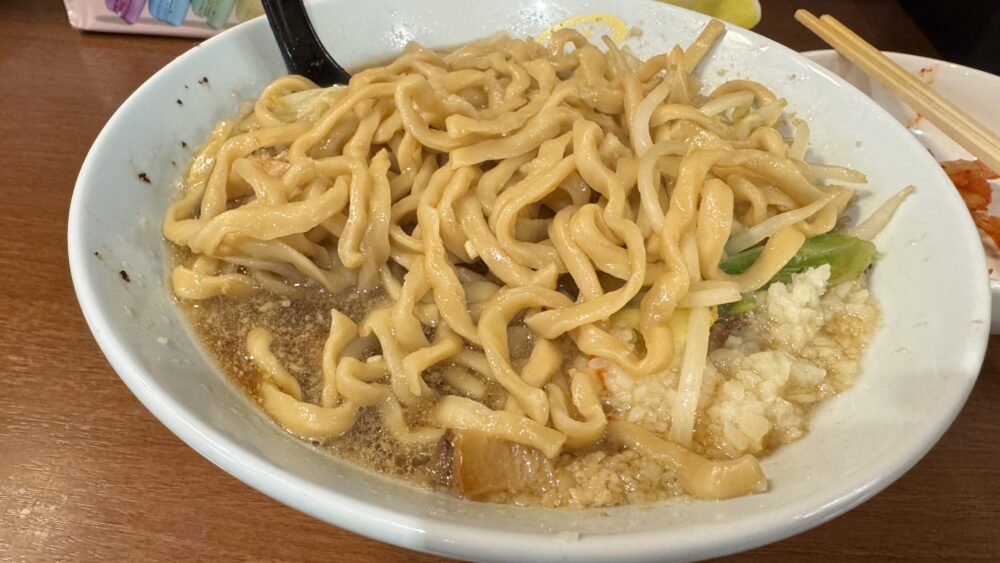▲ある程度上物を食べたら、天地返し。なるべくニンニクを温存して麺を混ぜ合わせます。