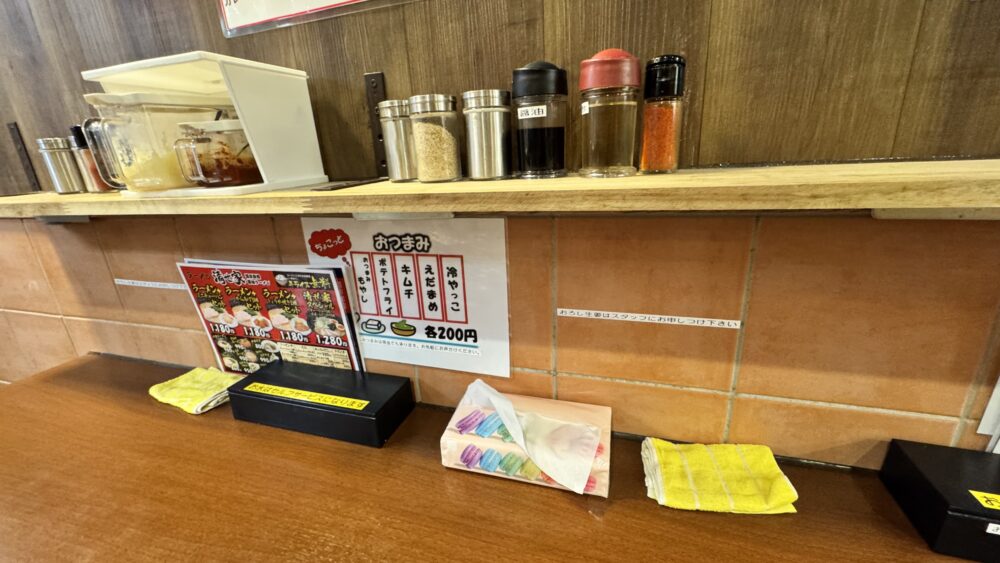 ▲卓上調味料は唐辛子・お酢・醤油・ニンニク・豆板醬など豊富なラインナップ。