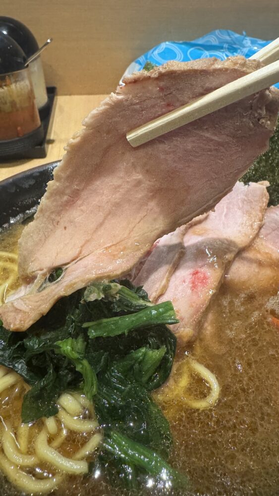 ▲チャーシューは大判でムチっと食感。濃厚スープに浸して食べると最高。