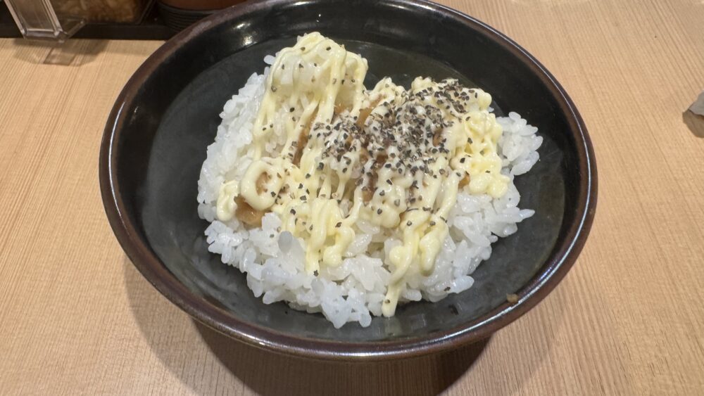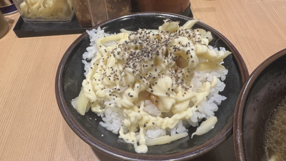 ▲ライスからの提供。無限にんにく、マヨネーズ、ブラックペッパーでジャンクに味付け。これがジャンクで旨い。