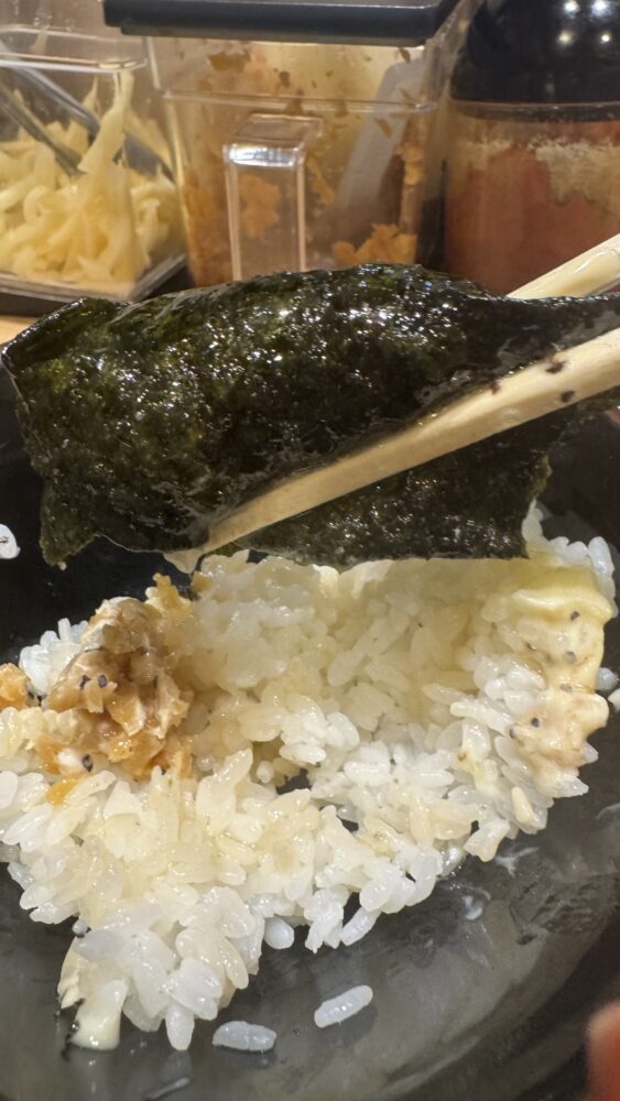 ▲スープに浸した海苔でライスを巻いて食べるとめちゃ旨。ジャンクな味付けのライスとも相性バッチリ。