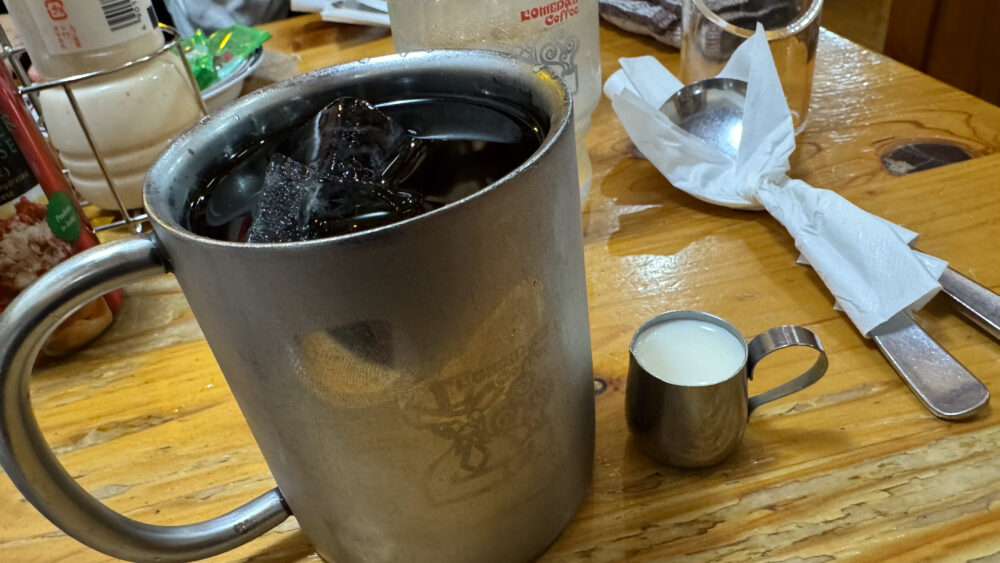 ▲アイスコーヒーからの提供。コメダ珈琲と言えばの金属製のマグカップでキンキンに冷えて美味しい。