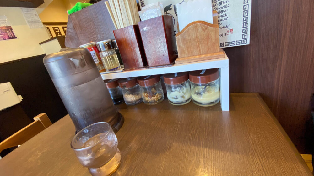 ▲卓上調味料はおろしにんにく、おろし生姜、揚げたまねぎ等、10種類以上あって味変し放題です。
