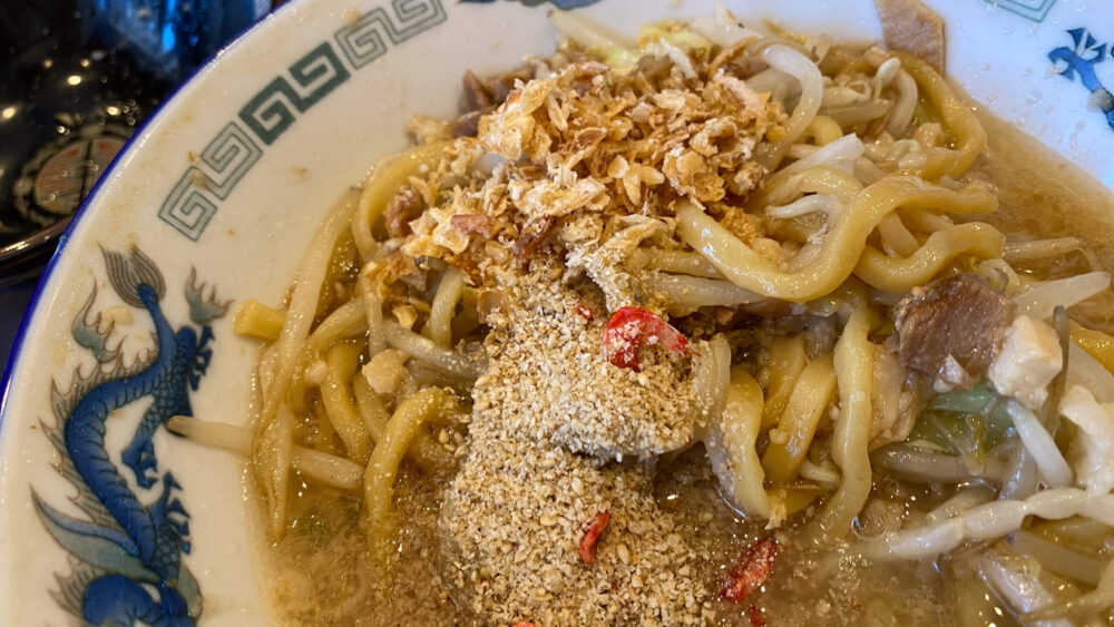 ▲続いて、卓上調味料の海老すりごまと揚げたまねぎで味変。海老やたまねぎの旨味と食感にアクセントがついて良き。