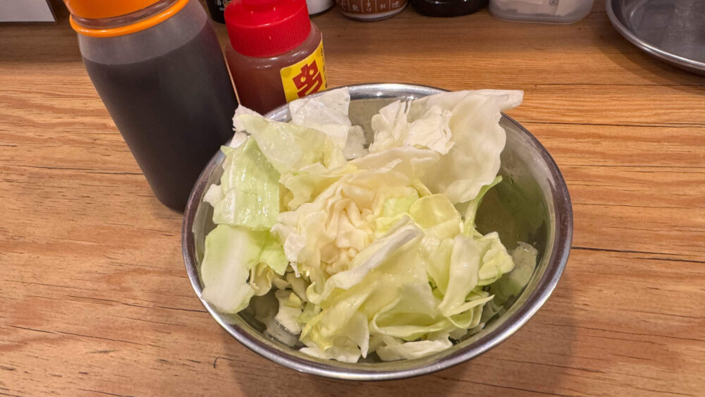 ▲お通しのキャベツ(税込300円)。ソースで食べますが、アテにも箸休めにもなります。