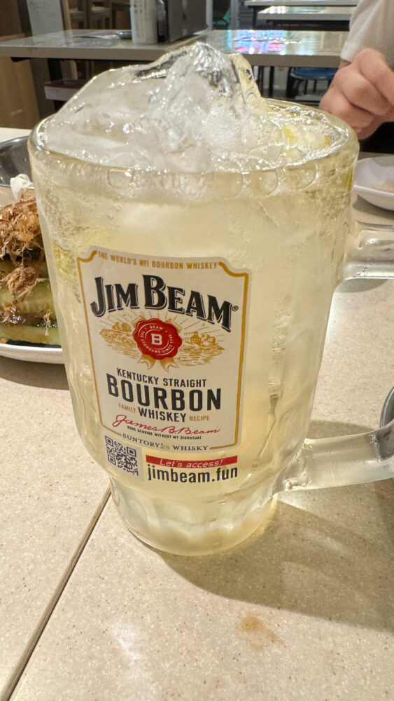 「ジムビームハイボール×2+ポテリコ+梅きゅうり+串カツ5本(キス+紅生姜+しいたけ+山芋+ハムカツ)+ジムビームハイボール メガ」を実食!