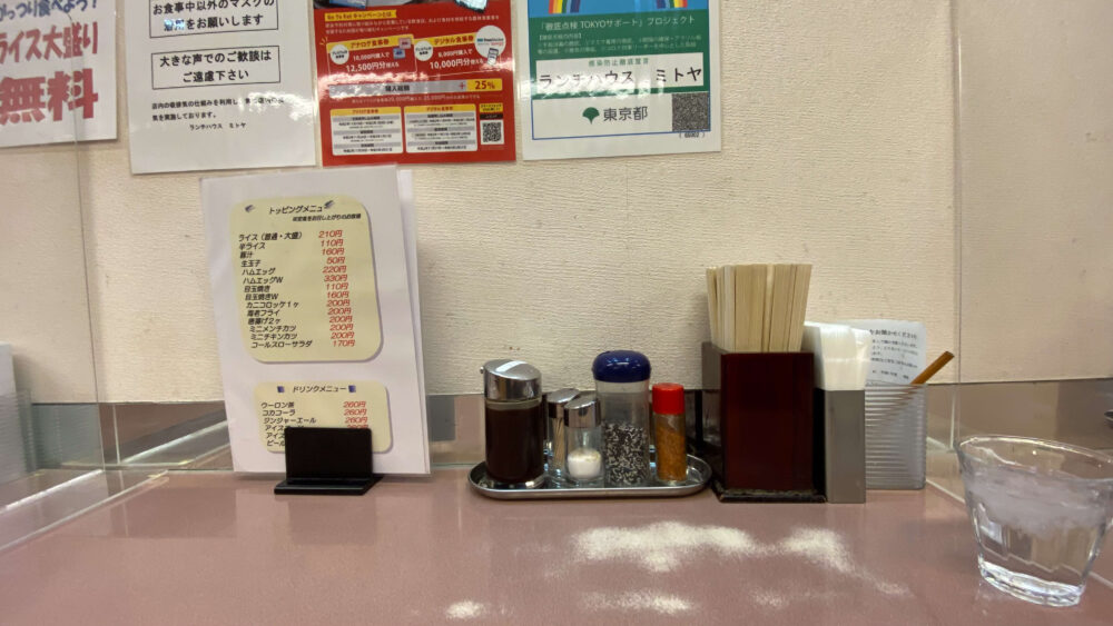 ▲卓上調味料は、ソース、塩、ごま塩、七味唐辛子。