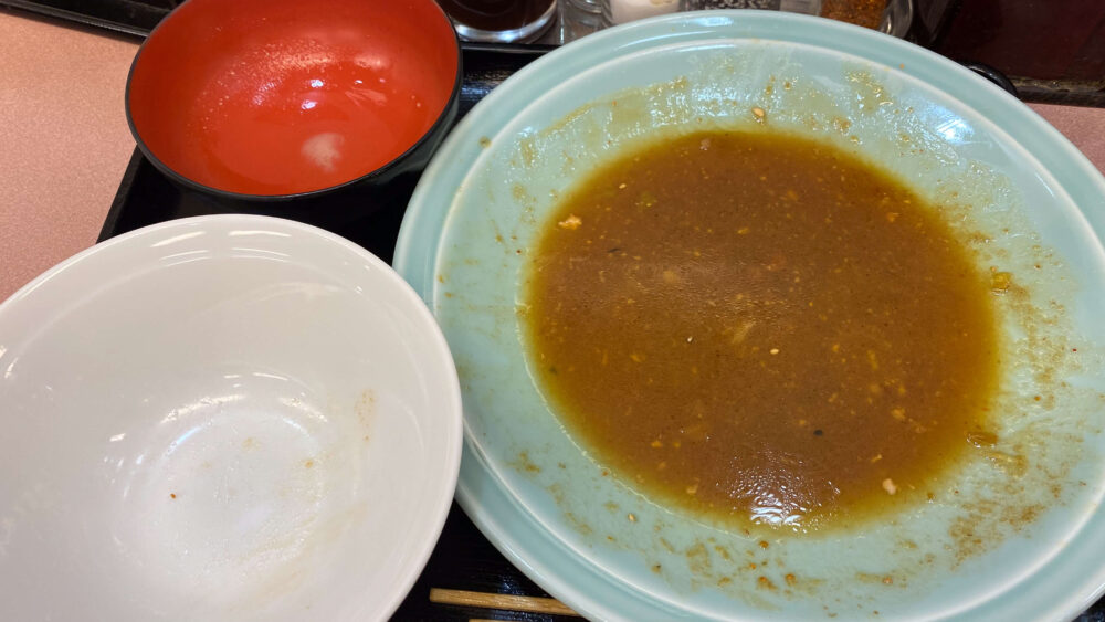 ▲終盤は卓上の七味唐辛子で辛さブースト!最後まで美味しくいただきます。
