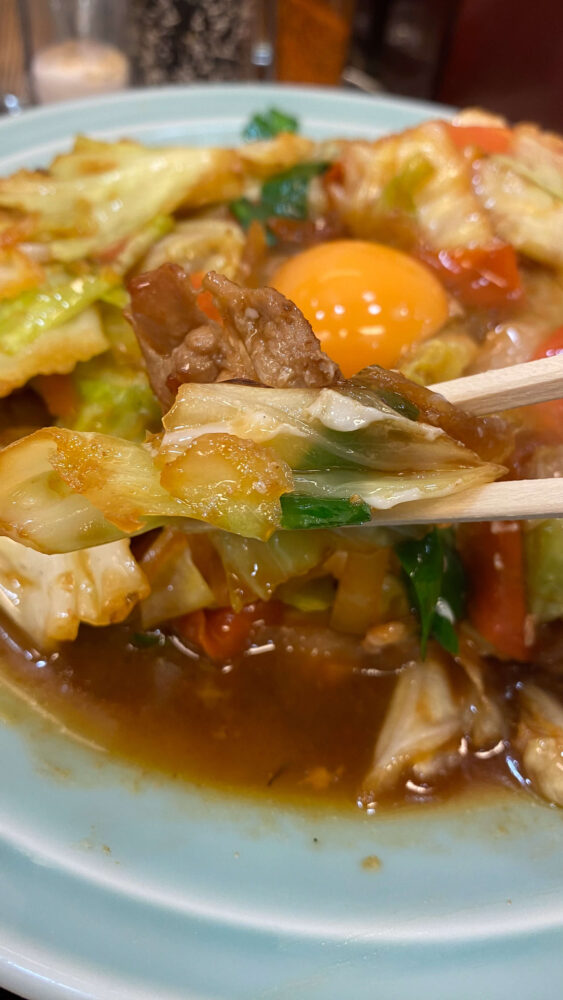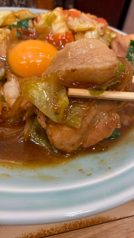 野菜と肉のタレ焼き定食は、回鍋肉的な美味しさをベースにしながら、さらに生卵の味変要素で最後まで美味しく食べられる工夫が最高でした!