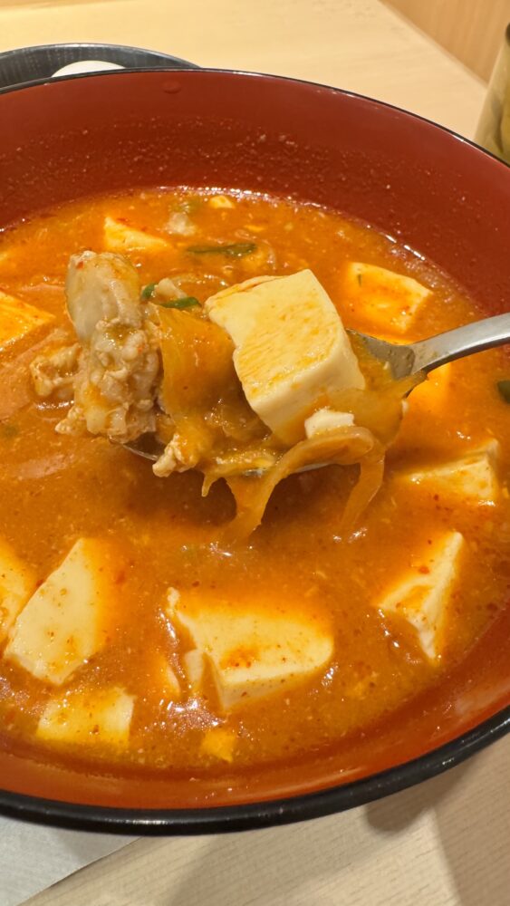▲鶏豆腐キムチチゲは具沢山。肉が鶏肉になった以外は松屋と同じ味わいで安定の辛旨さ。