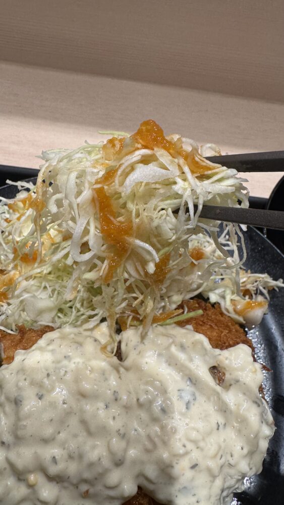 ▲タルタルソースで食べるチキンかつが濃厚で旨い。酸味もあって後味が重くならないのも良き。