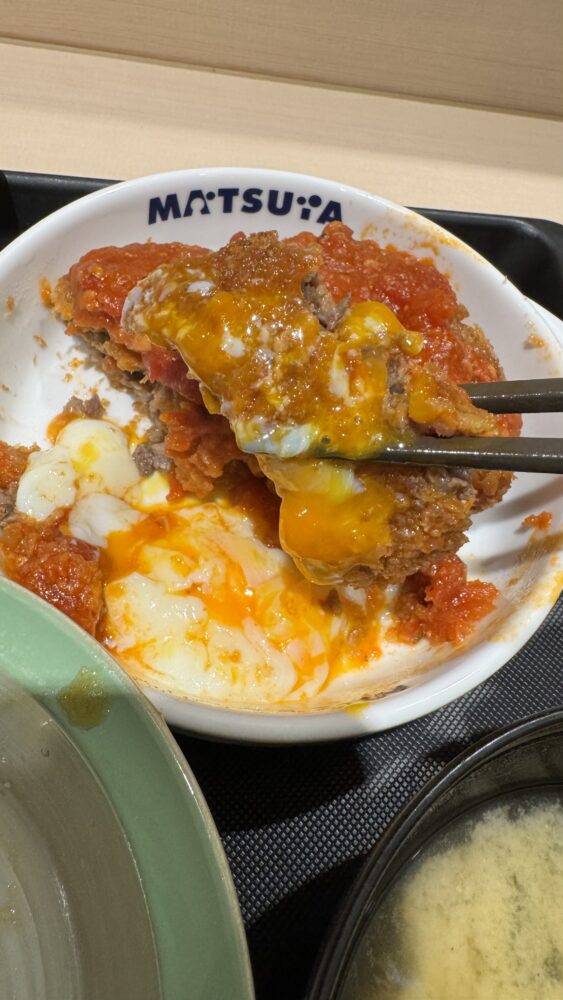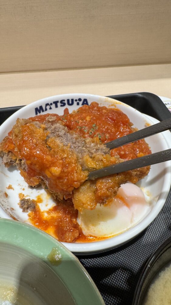松のやのうまトマメンチかつ定食は、松屋のうまトマソースをかけたジューシーなメンチかつがライス泥棒で最高な定食でした!