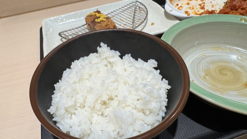 ▲ライスを並盛でお替り。うまトマメンチかつとソース+からしのロースかつを交互に食べ進めます。