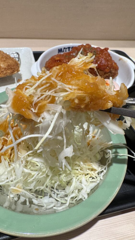 ▲まずはメンチかつから。松屋のうまトマソースがかかってめちゃ旨。ニンニクもがっつり効いていてライスが進む進む。