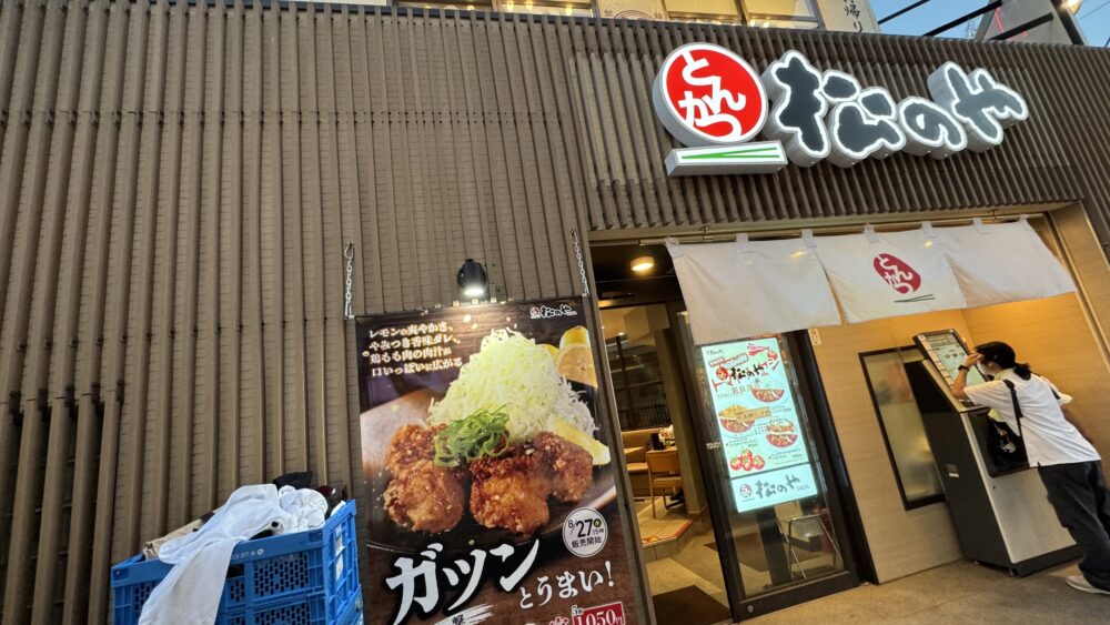 ▲デカデカと「松のや」の店名がわかります。券売機は店内にもあります。
