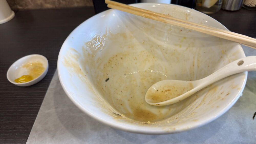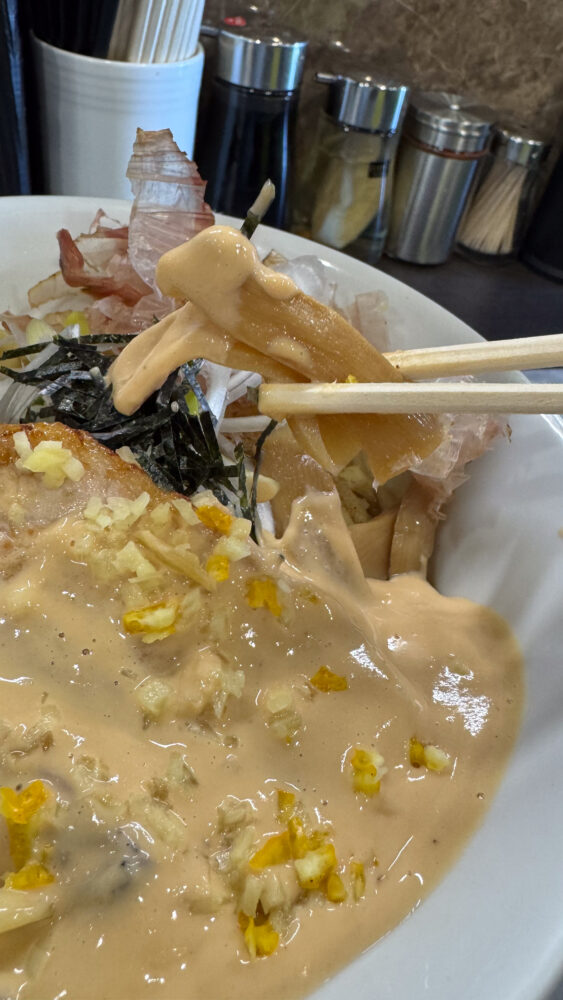▲途中、辛子で味変。ピリっとした刺激が味変に良き。この後商談だったのでにんにくは控えました。