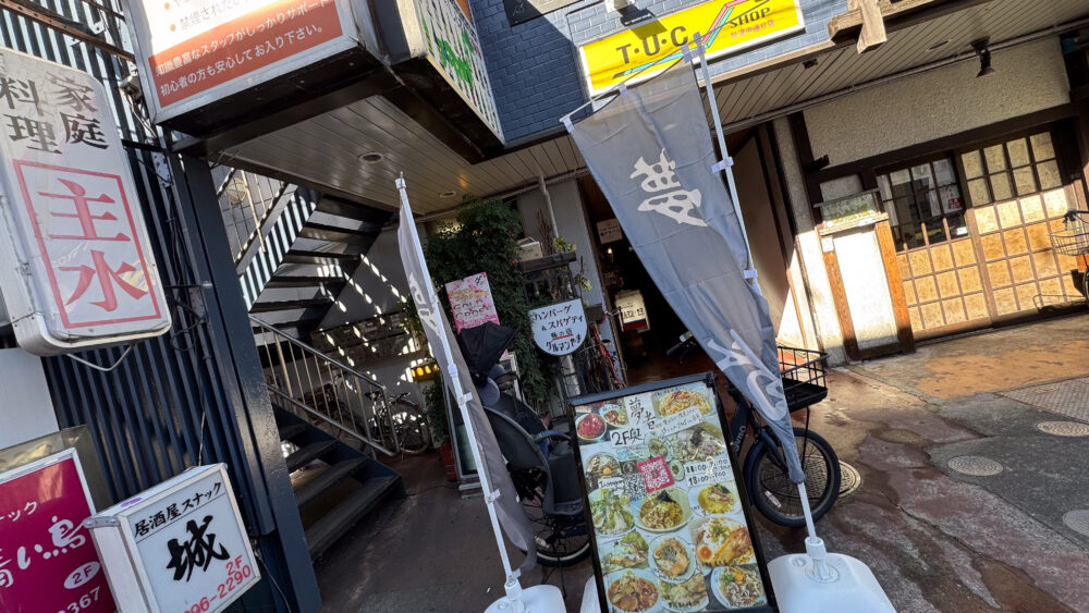 ▲店舗は2階の奥側右手にあります。階段付近の1階の写真。