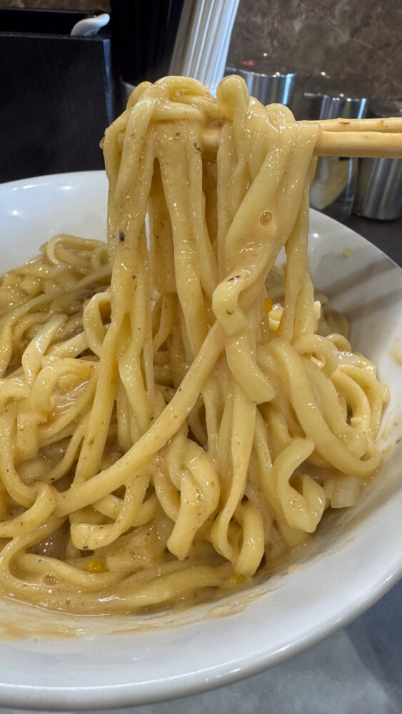 ▲麺は平打ち気味でツルモチ食感。あん肝の濃厚なペーストが絡んでめちゃ旨。後味は刻んだ柚子や生姜が爽やか。