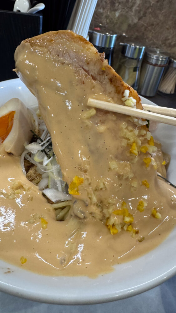 ▲あん肝のペーストの下に隠れているチャーシューがデカい。炙られているので香ばしく、あん肝の旨味もプラスされて美味。