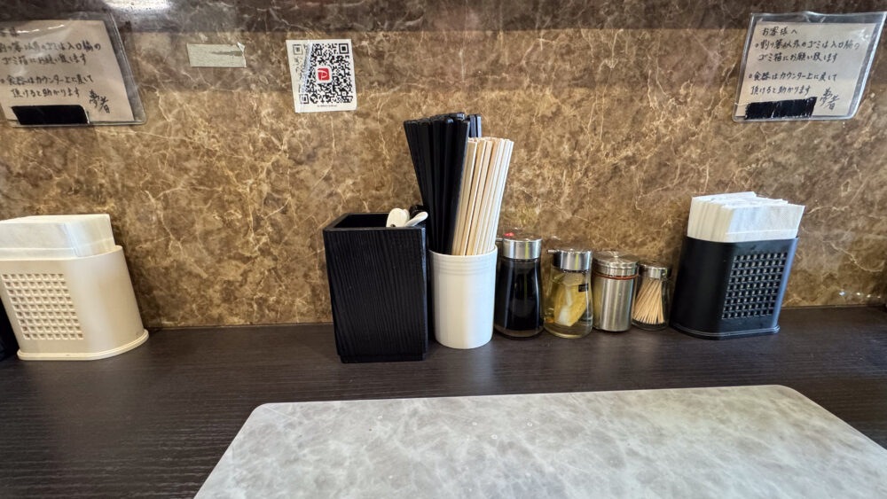 ▲卓上調味料は醤油、レモン酢、一味唐辛子。PayPay用のQRコードも各席に用意されています。