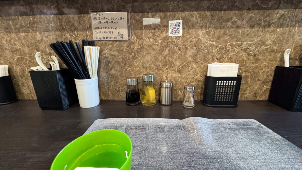 ▲卓上調味料は醤油、レモン酢、一味唐辛子。張り紙には「追い飯無料」とのありがたい記載あり。
