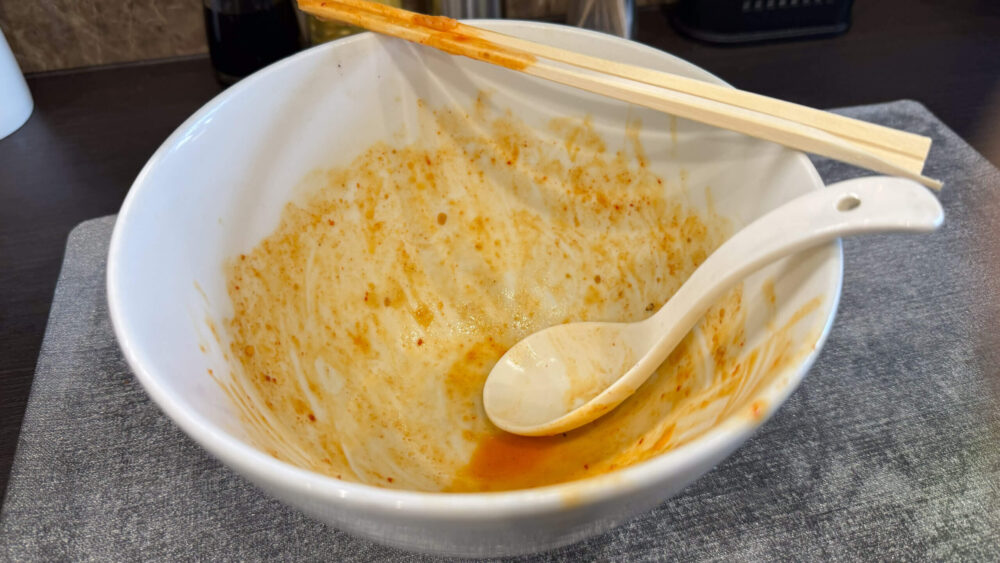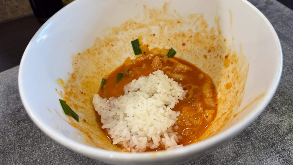 ▲麺があっという間になくなり、無料の追いライスをお願いしました。早速余ったタレへ投入。