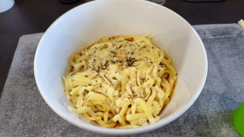 麺の上に大量にかけられたチーズが炙られていて美味しそう!うっすらと底に赤いタレが見えます。