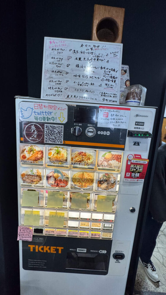 ▲食券機で注文します。食券機上の期間限定メニューは毎日入れ替わり、現金かPayPay払いです。