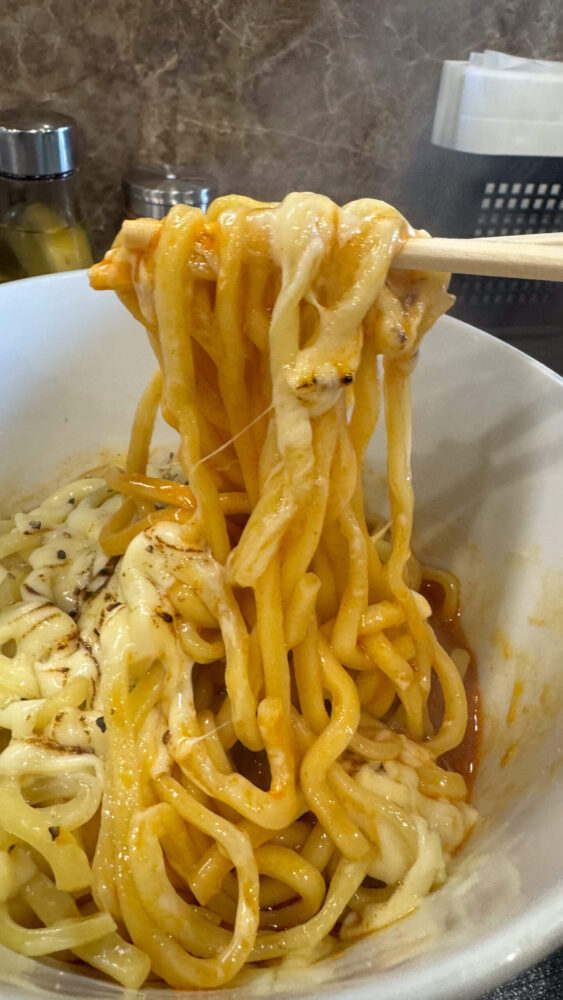 ▲しっかりと麺とチーズとタレを混ぜ合わせていきます。めちゃくちゃ美味しそう!