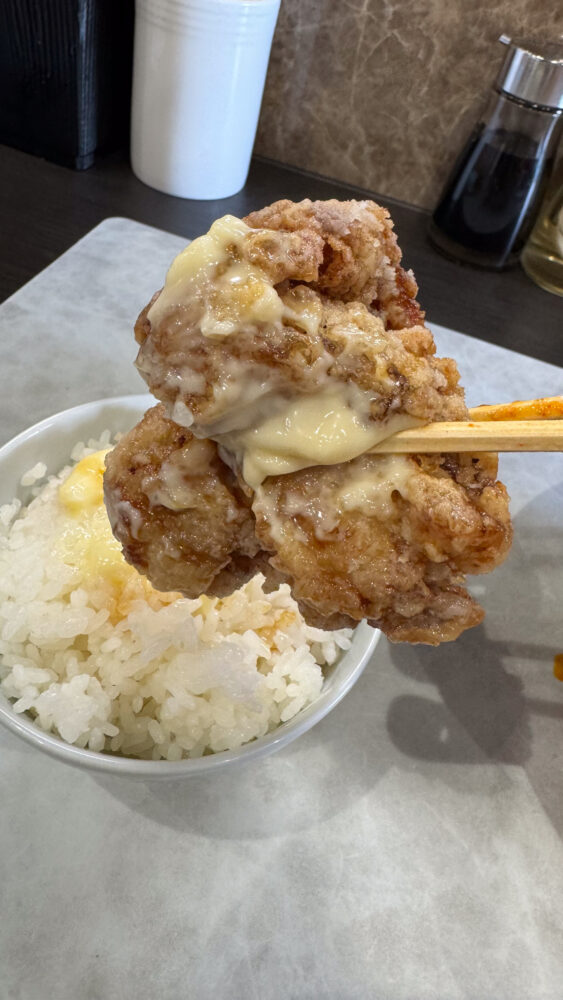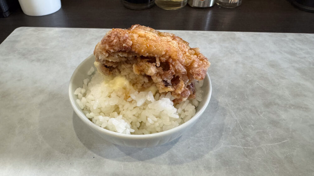 ▲合間に唐揚げも食べ進めます。衣はカラッと、中はジューシーでめちゃ旨。
