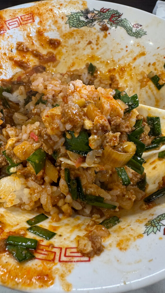 ▲麺を食べ終えたら無料の追いライスを投入。麻婆丼っぽいテイストでラストまで美味しい。