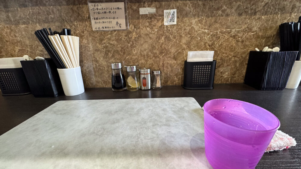 ▲卓上調味料は醤油、レモン酢、一味唐辛子。張り紙には「追い飯無料」とのありがたい記載あり。