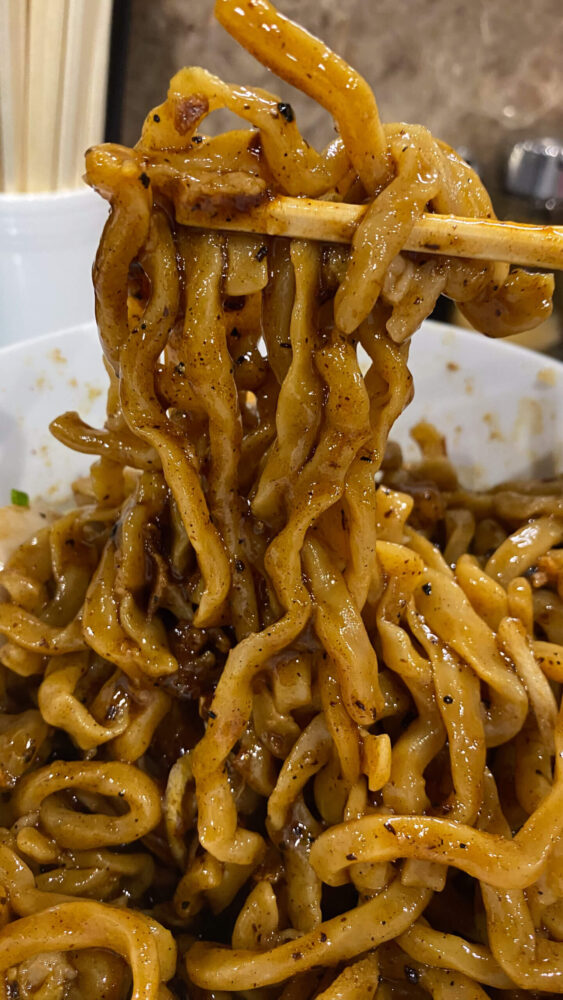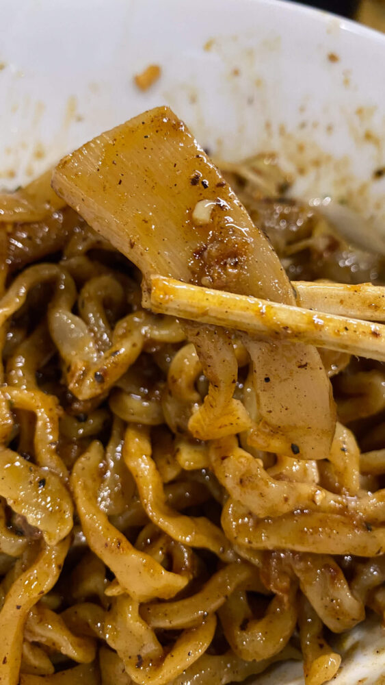 ▲二郎さながらなオーション麺はワシワシ食感!焦がし黒醤油のビターさとフライ状のニンニクやオニオン等のいろんな旨味や食感が混ざり合って激ウマ。